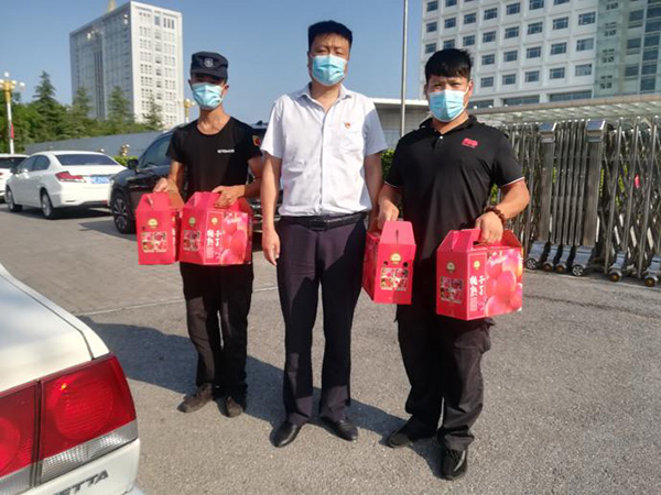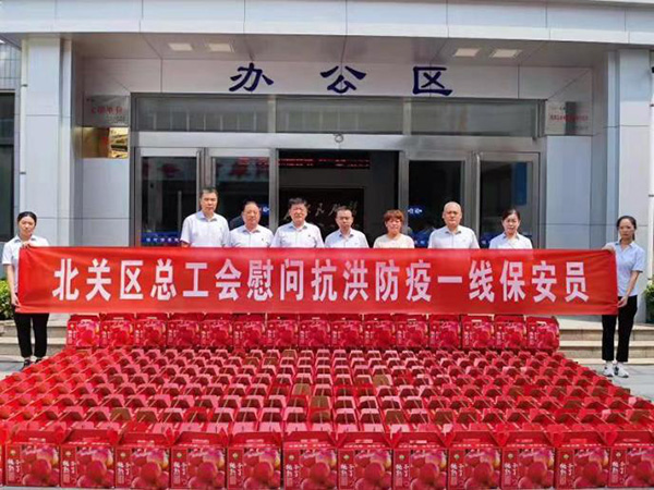 8月9日、10日北關(guān)區(qū)總工會(huì)副主席薛梅、保障部部長(zhǎng)司尚雯來到安陽市洹河保安服務(wù)有限責(zé)任公司,送來抗洪防疫慰問品鮮桃500多箱,向堅(jiān)守崗位、奮戰(zhàn)一線的保安隊(duì)員進(jìn)行慰問,提醒大家做好防控工作的同時(shí)一定要做好自身防護(hù)。